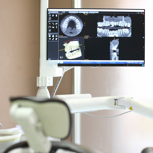 インプラント手術の前には、顎の骨のCT撮影を行います。CT撮影することで、インプラント手術予定部位の骨の状態が立体的にわかり、より確実・安全で予知性の高い手術が可能となります。また、糖尿病、リウマチ、出血が止まりにくいといった全身状態にも配慮して手術を行います。必要な場合は、医療機関(東京医科歯科大学医学部付属病院等)と連携のうえ手術を行います。